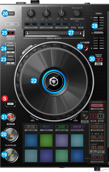 - SLIP: Enables Slip Mode on each deck. Several software functions (such as Jogwheel movements, HotCues and Loops) will apply temporary on the track, and the track will return to the position it would have been when those functions are not triggered.