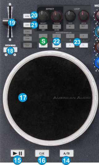 To continue playback without returning to the Temporary Cue Point, press and hold the Cue Button, then press and hold the Play Button, and then release both buttons. - JOG. Touch-sensitive jogwheel for scratching (Vinyl Mode), pitch bending (CD mode) and other functions described in this manual. If the jogwheel is on Scratch (Vinyl) mode, use the outer ring of the jogwheel to pitch-bend. Hold SHIFT down and then use the jogwheel to fast search through the loaded track (Seek mode)