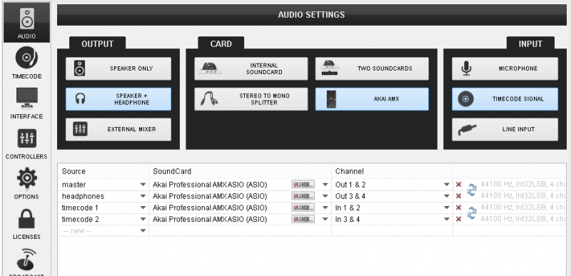 Connect your Timecode devices at the rear panel of the AMX, open the AUDIO page of VirtualDJ Config and click on the TIMECODE button of the INPUT tab. VirtualDJ will automatically create the following Audio configuration.