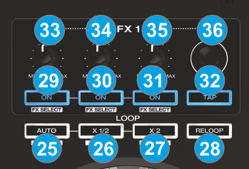 Multi FX Mode. Press this button to trigger the selected Effect on FX Slot 3. Hold SHIFT down and then press this button to select the next Effect for FX Slot 3. - TAP. Manually adjust the tempo of the song. Tap this button at the same tempo as the track to help the software detect a different BPM reading (if needed). Hold SHIFT down and then use this button to toggle between the Single and Multi FX modes.