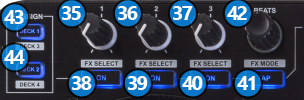 The Left FX unit (FX1) controls the effects of the Left selected software deck (1 or 3) and the Right FX unit (FX2) controls the effects of the Right selected software deck (2 or 4) respectively.