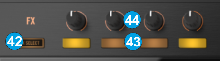 When in FX Select view, use these buttons to select/highlight the FX Slot in order to select an Effect for it. - FX KNOB : Adjust the 1st Parameter of the selected Effects of FX Slots 1 to 4. Hold SHIFT down and then use these knobs to adjust the 2nd Parameter of the selected Effects of FX Slots 1 to 4.