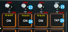 The upper 4 PADs (24) of the Mixtrack Pro II offer multi-slot Effect controls and Quick Loops if SHIFT button is pressed.