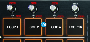 Press and hold SHIFT (19) down and then use the 4 upper PADs (24) to trigger a Loop of different beats size (1, 2, 4 and 16 beats) as per the image.
