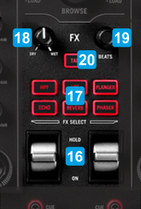 16 FX ON/HOLDTriggers the selected Effect. Move the paddle triggers up (for toggle) or down for momentary. No Effect is applied when at middle position. 17 FX SELECTSelect an Effect for both Left/Right Decks. Pre-defined Effects are High-Pass Filter, Low-Pass Filter, Flanger, Echo,Reverb and Phaser. Led will blink when the Effect is enabled on any of the Left/Right decks. Only one Effect can be selected each time. 18 FX DRY/WETAdjust the 1st Parameter - usually the Strength - of the selected Effect on both Left/Right Decks.19 FX BEATSAdjust the 2nd Parameter - usually the Beats - of the selected Effect on both Left/Right Decks.20 TAPWhen track is paused, set current position as 1st beat of the Beat-grid, or tap beat when track is playing to manually adjust Track's BPM.Re-analyze track for BPM and Key