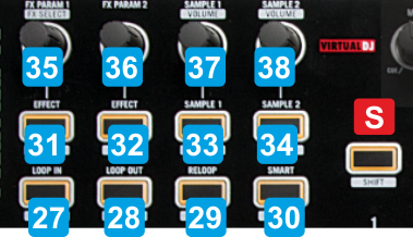 S SHIFTPress this button down to access secondary actions as described in the SHIFT ACTION column27 LOOP INSet a Loop In (Start) point for a manual loopHalves the size of the loop28 LOOP OUTSet a Loop Out (End) point for a manual loop. Use the same button to exit a loop if enabledDoubles the size of the loop 29 RELOOPEnables the last triggered loop, or exits the loop if enabledWhen a loop is enabled, moves the loop backwards by the amount of beats equal to the current loop size30 SMARTTurns Smart Loop mode on/off. When enabled, manual loops will auto-adjust to the nearest loop size (in whole beats) providing a seamless loopWhen a loop is enabled, moves the loop forward by the amount of beats equal to the current loop size31 EFFECT/DELETEturns the selected Effect on/offEnables/disables the HotCue Delete mode32 EFFECT/CUE1no actionAssigns or jumps (if assigned) to Hotcue 1. If the Delete mode is enabled, deletes the Hotcue 133 SAMPLE1-3/CUE2Trigger 1st/3rd Sample from the Selected Sampler BankAssigns or jumps (if assigned) to Hotcue 2. If the Delete mode is enabled, deletes the Hotcue 234 SAMPLE2-4/CUE3Trigger 2nd/4th Sample from the Selected Sampler BankAssigns or jumps (if assigned) to Hotcue 3. If the Delete mode is enabled, deletes the Hotcue 335 FX PARAM1Adjust the 1st Parameter of the selected EffectSelects an Effect36 FX PARAM2Adjust the 2nd Parameter of the selected Effect37 SAMPLE1Select the Sampler Trigger modeAdjust the Volume of Samples 1 (Left side) and 3 (Right side) 38 SAMPLE2Select and loads a Sampler BankAdjust the Volume of Samples 2 (Left side) and 4 (Right side)
