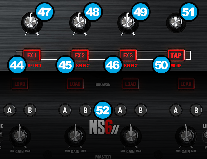 Both Effect units (on the left and right side of NS6II) offer 2 different operation modes and they control the Effects applied on the corresponding left or right deck.