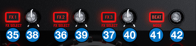 Hold down SHIFT and turn the knob to control the 2nd effect parameter of the selected effect of slot 2 (if available). - FX3 knob: Controls the 1st effect parameter of the selected effect of slot 3.