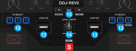 - FX LEVEL: Use this knob to adjust the 1st Parameter of the selected Effects (usually the Wet/Dry) in all Decks