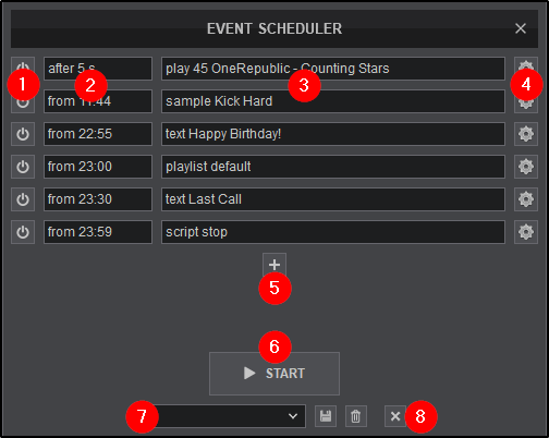 The Event Scheduler provides an easy to use interface that will automate VirtualDJ functions in sequential order based on time. This feature is used to automatically start and or/stop predetermined events such as playing a playlist or sample, adding text or a slideshow to the screen, or even using VDJScript for more complex event actions.