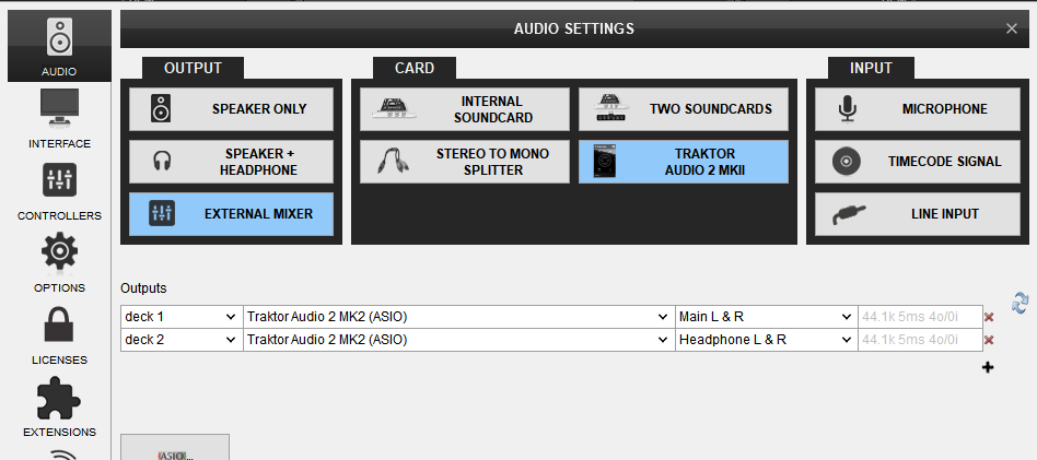 - Click on the TRAKTOR AUDIO 2 MKII special button in the Audio tab of VirtualDJ and then select the EXTERNAL MIXER button. You should then get the following Audio configuration. Click to APPLY