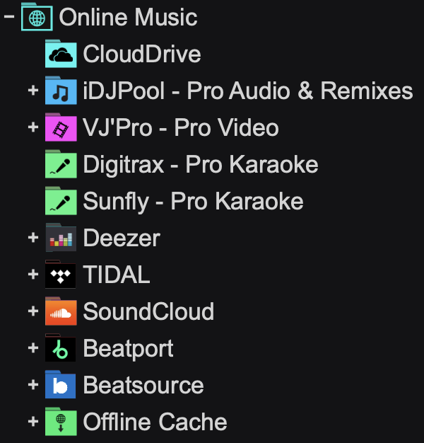 The Folder List offers all of the basic drive and folder elements of your Computer, some dedicated VirtualDJ folders, along with some popular 3rd party software folders. The main folders are compressed for better organization by default. Clicking on the button to the left of any folder will expand it and show it's related sub-folders.
