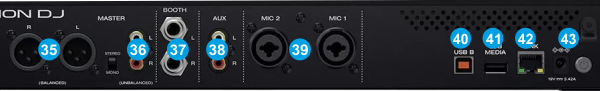 - BOOTH OUT (XLR): Use TRS cables to connect this output to a booth monitoring system. The level of this output is controlled by the Booth Level knob on the top panel.