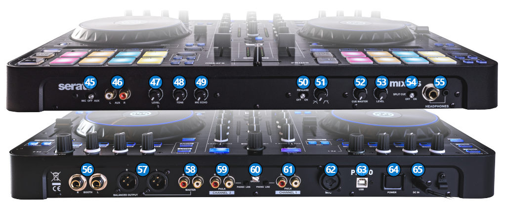 MIC/AUX LEVEL: Adjust the level of the Mic (62) or Aux (46) input.