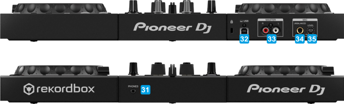 31 PHONESUse a 1/4" mini-jack cable/adapter to connect a pair of Headphones for pre-listening. The Volume of this output is controlled from the top panel32 USBUse a standard USB cable to connect DDJ-400 to a USB port of a computer33 MASTERUse standard RCA Stereo cable to connect to amplifier/speakers. The Volume of this un-balanced output is controlled from the top panel34 *MICUse a 3/4" TRS cable/adapter to connect a Microphone.35 *MIC LEVELAdjust the level of the Microphone input signal.* Note: The Microphone input is not part of the USB Audio Interface of the DDJ-400, therefore it cannot be included to the Audio setup of VirtualDJ, nor can be recorded along with your mix.