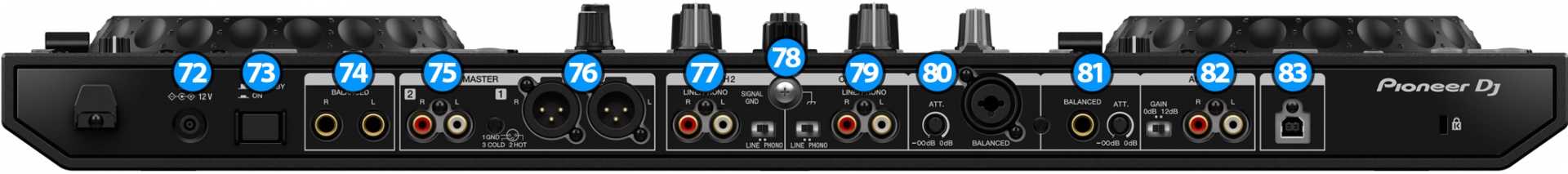 BOOTH OUT: Booth signal output (TRS – Balanced). The strength of the signal is controlled by “BOOTH MONITOR LEVEL” knob (15) on the mixer section. Use it to connect your booth speakers, or an amp that needs different sound output level than master output.