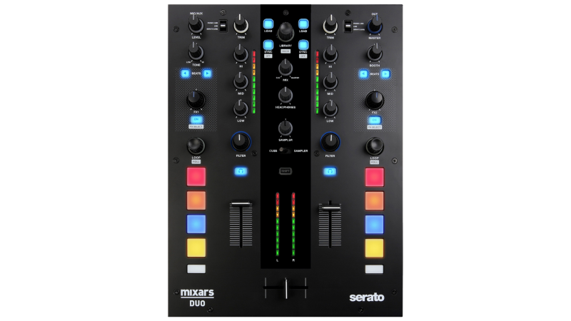The Mixars DUO MKII is an update to the popular DUO two channel DJ mixer. It features the all new Galileo Essential crossfader exclusively designed in collaboration with Pro X Fade. Made in Japan, this crossfader is built with the latest conductive plastic technology and features razor sharp cuts for precise scratching. 2-channel battle style mixer. Upgraded w/ exclusive GALILEO crossfader co-designed by Pro X Fade integrated 24-bit/96kHz audio interface. 8 RGB rubber pads for controlling cues + samples