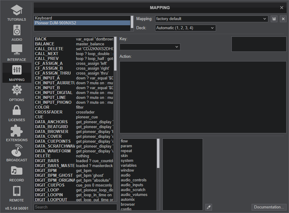 DJM-900NXS2 (or DJM-A9 / DJM-V10 depending the mixer of your setup) should be visible in the MAPPING tab of Config and the “factory default” should be available/selected from the Mappings drop-down list. The factory default Mapping of the mixer also hosts the mapping of the connected CDJ devices that are connected via LINK protocol on the mixer.