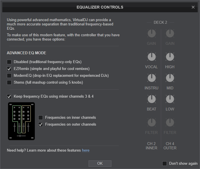 This order also allows you to manipulate stems of VirtualDJ by using the outer mixer channels if you use only 2 decks for mixing.