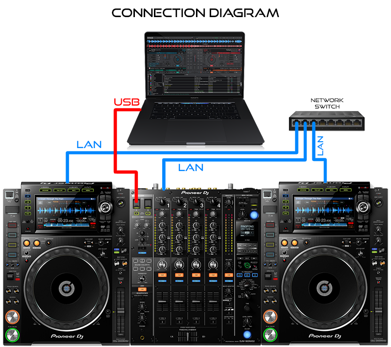 It allows the end user to connect up to 4 CDJ devices and a DJM mixer via LAN cables (LINK) and then use one single USB connection on the mixer to connect them all via HID protocol to a PC/MAC computer.