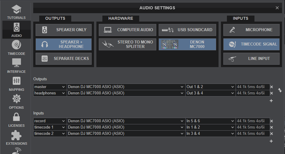 • Open VirtualDJ Settings ->AUDIO tab ans press the TIMECODE SIGNAL button from the INPUT tab