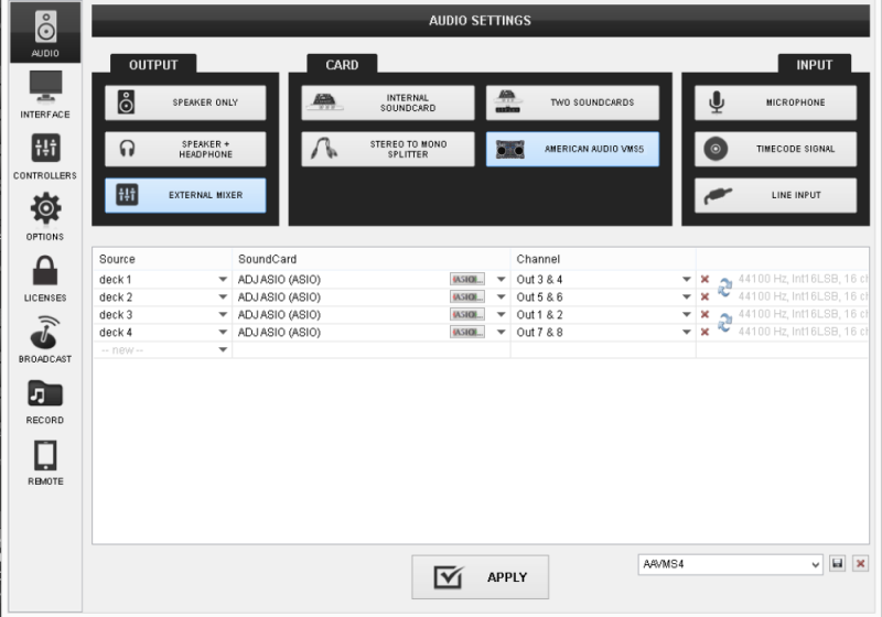 A Pro Infinity a PLUS Controller, a Subscriber License or a LE keycode is required to use the American Audio VMS5. Without any of the above Licenses, the controller will operate for 10 minutes each time you restart VirtualDJ.