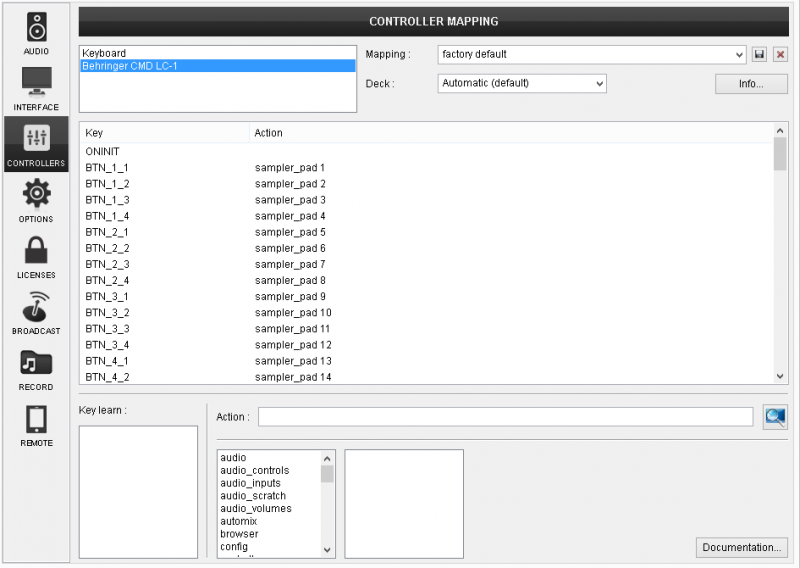 The unit should be visible in the CONTROLLERS tab of Config and the “factory default” available/selected from the Mappings drop-down list. The factory default Mapping offers the functions described in this Manual, however those can be adjusted to your needs via VDJ Script actions.