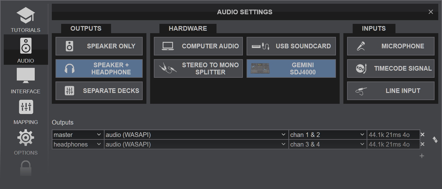 Click on the "SDJ4000" button for VirtualDJ to apply the predefined audio setup with the built-in sound card of the Gemini SDJ-4000. You can still change that from Settings->AUDIO tab.