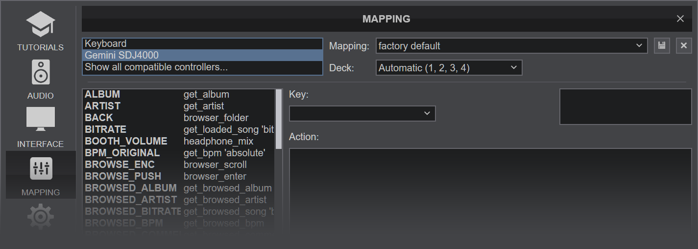 The unit should be visible in the CONTROLLERS tab of Config and the “factory default” should be available/selected from the Mappings drop-down list. The factory default Mapping offers the functions described in this Manual, however those can be adjusted to your needs via VDJ Script actions.