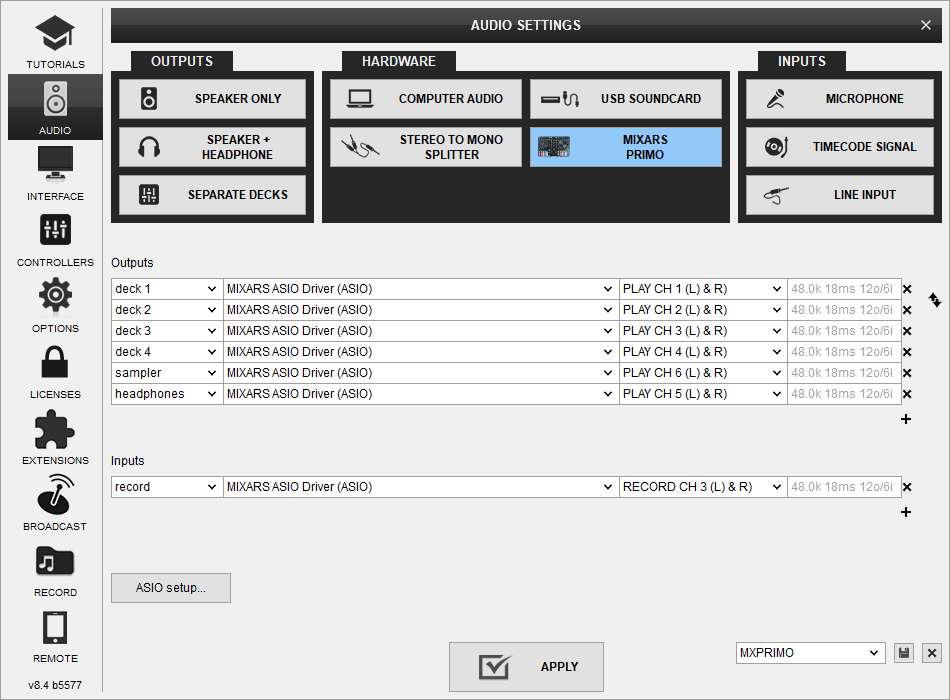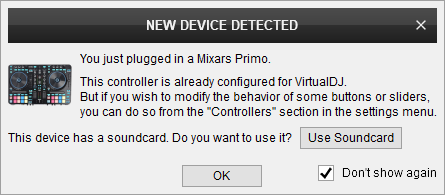 Click on the "Use Soundcard" button for VirtualDJ to apply the predefined audio setup with the built-in sound card of the Mixars Primo. You can still change that from Settings->AUDIO tab.