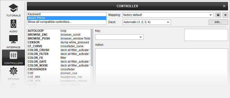The unit should be visible in the CONTROLLERS tab of Config and the “factory default” should be available/selected from the Mappings drop-down list. The factory default Mapping offers the functions described in this Manual, however those can be adjusted to your needs via VDJ Script actions.