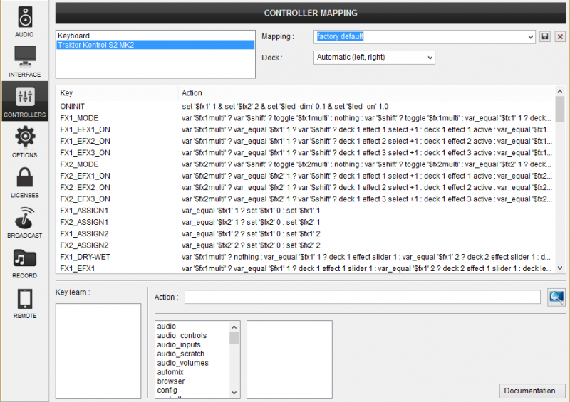 The unit should be visible in the CONTROLLERS tab of Config and the “factory default” available/selected from the Mappings drop-down list. The factory default Mapping offers the functions described in this Manual, however those can be adjusted to your needs via VDJ Script actions.