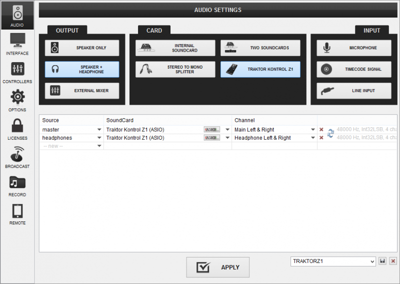 The unit has a pre-defined Audio setup and a special button in the AUDIO tab of Config to provide that. Alternative Audio setups can be applied in the same window.