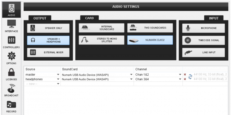 This unit does not have a built in sound interface and therefore you need to use a separate soundcard (such as Numark DJiO2) as per the screenshot below. Please note that if you are using a PLUS Controller or a LE License then only a “Master + Headphones” audio setup is valid regardless of the capabilities of your soundcard..