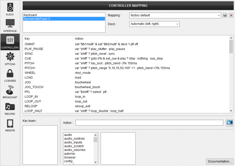 The unit should be visible in the CONTROLLERS tab of Config and the “factory default” available/selected from the Mappings drop-down list. The factory default Mapping offers the functions described in this Manual, however those can be adjusted to your needs via VDJ Script actions.