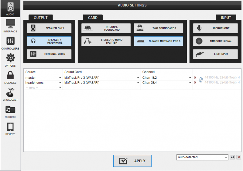 Click on the "Use Soundcard" button in order VirtualDJ to apply the pre-defined audio configuration (speakers need to be connected to the rear side of the unit in this case).