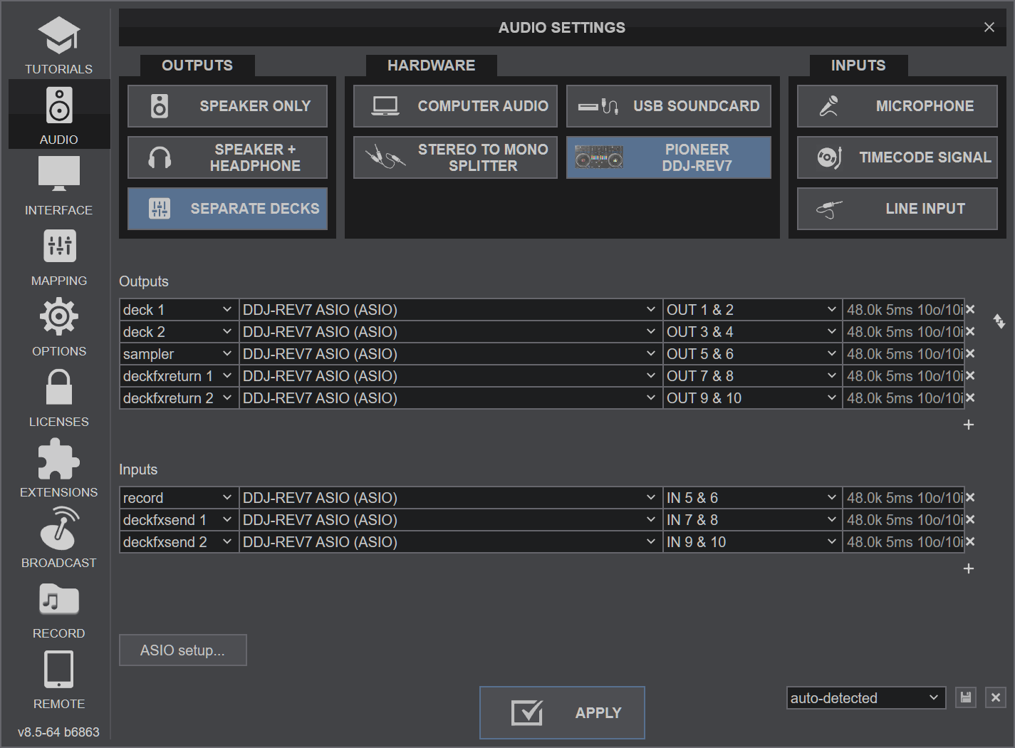 Click on the "DDJ-REV7" button for VirtualDJ to apply the predefined audio setup with the built-in sound card of the Pioneer DDJ-REV7. You can still change that from Settings->AUDIO tab.
