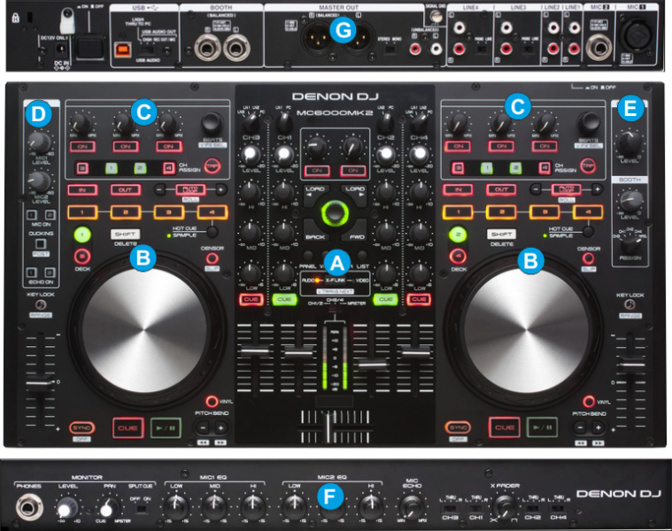 Denon DJ - MC-6000 MKII LAYOUT A: MIXERB: DECK CONTROLSC: EFFECTSD: MICROPHONESE: MASTER & BOOTHF: FRONT PANELG: REAR PANEL Mixer