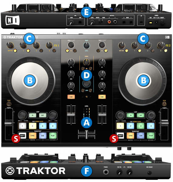 S SHIFT: Hold this button down to access secondary functions of the Kontrol S2MK2 (mainly in white lettering)