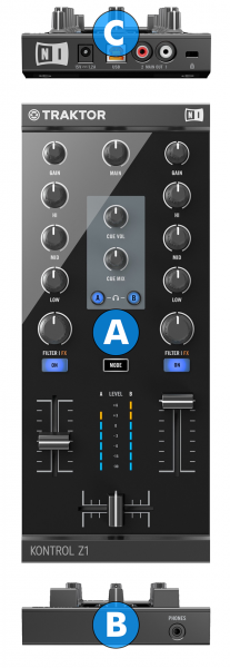 Native Instruments - Kontrol Z1 LAYOUTThe functionality of each button, knob and slider per section (as shown in the image on the side) will be explained in detail in the next chapters: A. MIXERB. FRONTC. REAR Mixer