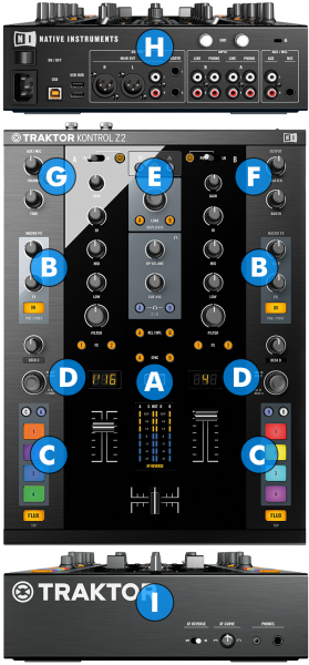 Native Instruments - Kontrol Z2 LAYOUT The functionality of each button, knob and slider per section (as shown in the image above) will be explained in detail in the next chapters A. MIXERB. EFFECTSC. HOTCUESD. LOOPSE. BROWSERF. MASTERG. MIC - AUXH. REARI. FRONT Mixer
