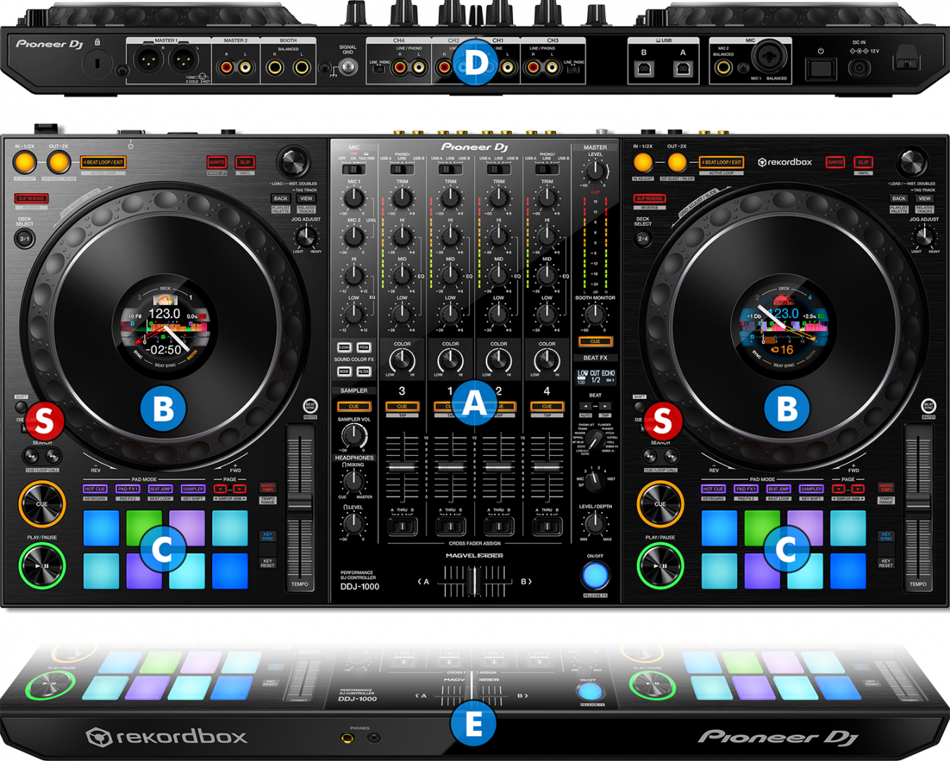 S SHIFT: Hold this button down to access secondary functions of Pioneer DDJ-1000 (mainly in black lettering inside a gray box)