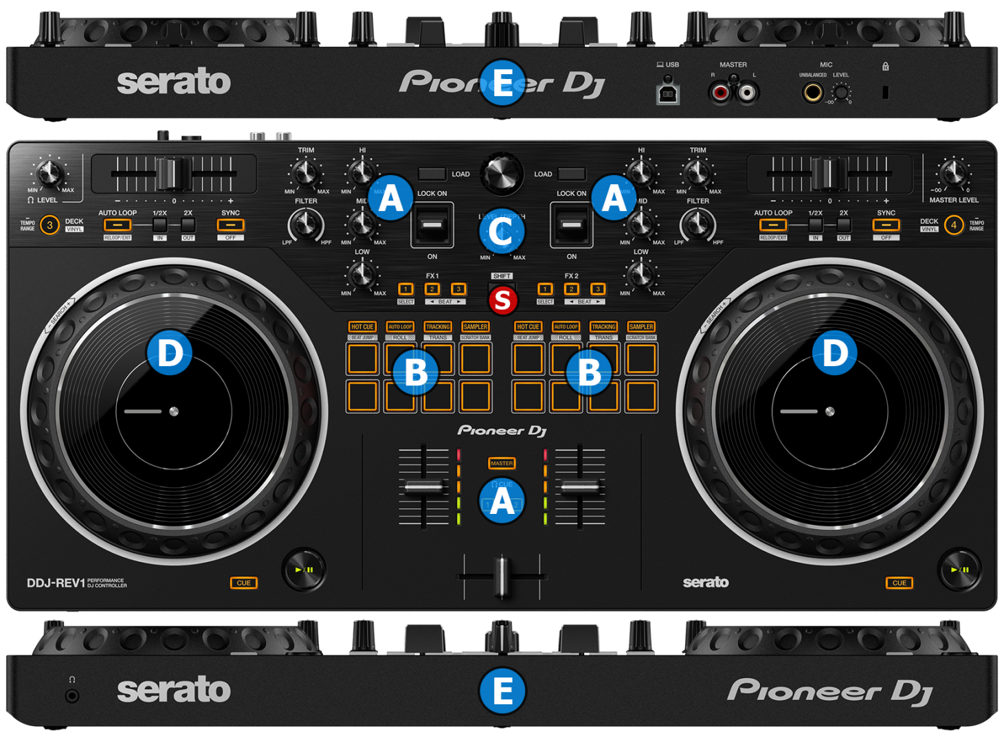 S SHIFT Press and hold this button to access secondary functions of other controls on the DDJ-REV1