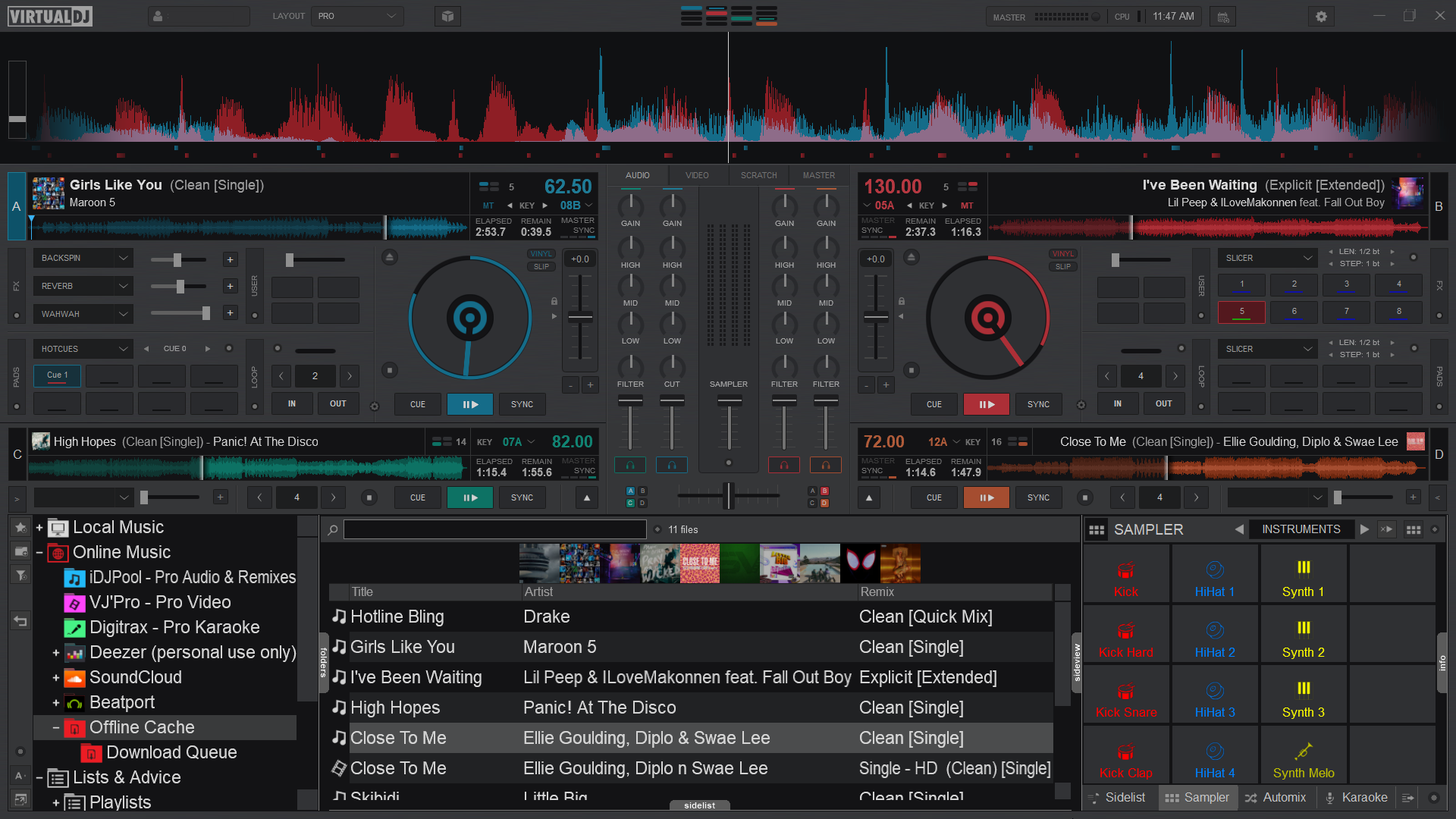 Phrase Bars Phrase Circles 4-DecksDisplays 4-Deck Mode. Once selected additional display options are available. The default display is 4-Deck with a 2+2 Channel Mixer but can be changed to a full 4-Channel Mixer.