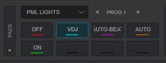VirtualDJ has pre-defined 3 different Programs for the Party Mix Live Leds and those are available when the VDJ PRG (2) mode is selected. The Programs 1 to 3 can be selected from the PML Lights Pads page using the arrow buttons (1st Parameter)