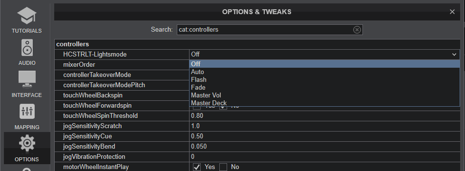 Open VirtualDJ Settings ->OPTIONS tab ->CONTROLLER sub-category and select one of the available values for the setting