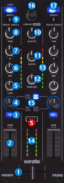 SSHIFT. Press and hold this button to access secondary functions (black lettering in white box) of other controls on Mixars Primo