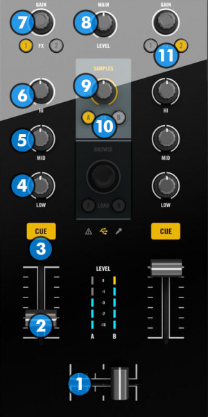 CROSSFADER: Blends audio between the left and right channels/decks.