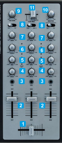 1 CROSSFADERBlends audio signals from left and right decks2 VOLUMEAdjust Volume Output for Left and Right deck3 CUE/PFLSend the audio signal of a Mixer Channel to the Headphones Channel4 EQ BASSAdjust the Equalizer Low Band frequencies (Bass) of each mixer channel5 EQ MIDAdjust the Equalizer Middle Band frequencies of each mixer channel6 EQ HIGHAdjust the Equalizer High Band frequencies (Treble) of each mixer channel7 GAINAdjust the pre-fader Output level (Gain) of each mixer channel8 CH SOURCESelect the Source of each mixer channel. Set both Left and Right switchers to PC position to control left and right assigned VirtualDJ decks9 CUE GAINAdjust the Output Level of the Headphones Channel10 MASTER VOLAdjust the Level of the Master Output11 CUE/PFL CROSSFADERBlends audio signal in the Headphones Channel from the Master Output and the mixer channels that have been sent to the Headphones via the CUE/PFL buttons