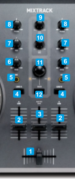 1 CROSSFADERBlends audio signals from left and right decks2 VOLUMEAdjust Volume Output for Left and Right deck3 MASTER VOLUMEAdjust the Volume level of the Master Output4 LOADLoads the selected track on the Left/right deck5 CUE/PFLSend the audio signal of the Left/Right Deck to the Headphones Channel6 EQ BASSAdjust the Equalizer Low Band frequencies (Bass) of each mixer channel7 EQ MIDAdjust the Equalizer Middle Band frequencies of each mixer channel8 EQ HIGHAdjust the Equalizer High Band frequencies (Treble) of each mixer channel9 CUE GAINAdjust the Output Level of the Headphones Channel10 CUE MIXBlends audio signals in the Headphones channels between the Master Output (when in MIX position) and the decks that have CUE/PFL enabled (when in CUE position)11 BROWSEScroll through folders and tracks Push to set focus to the next Browser window12 BACKSet focus to Folders list. If focus is in Folders list, open/close sub-folders